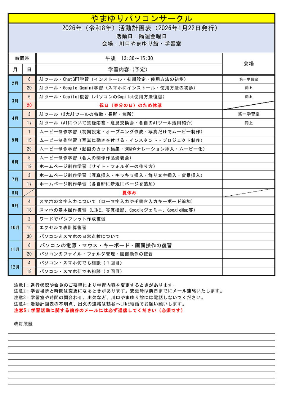やまゆりパソコンサークル 2026年・活動計画表